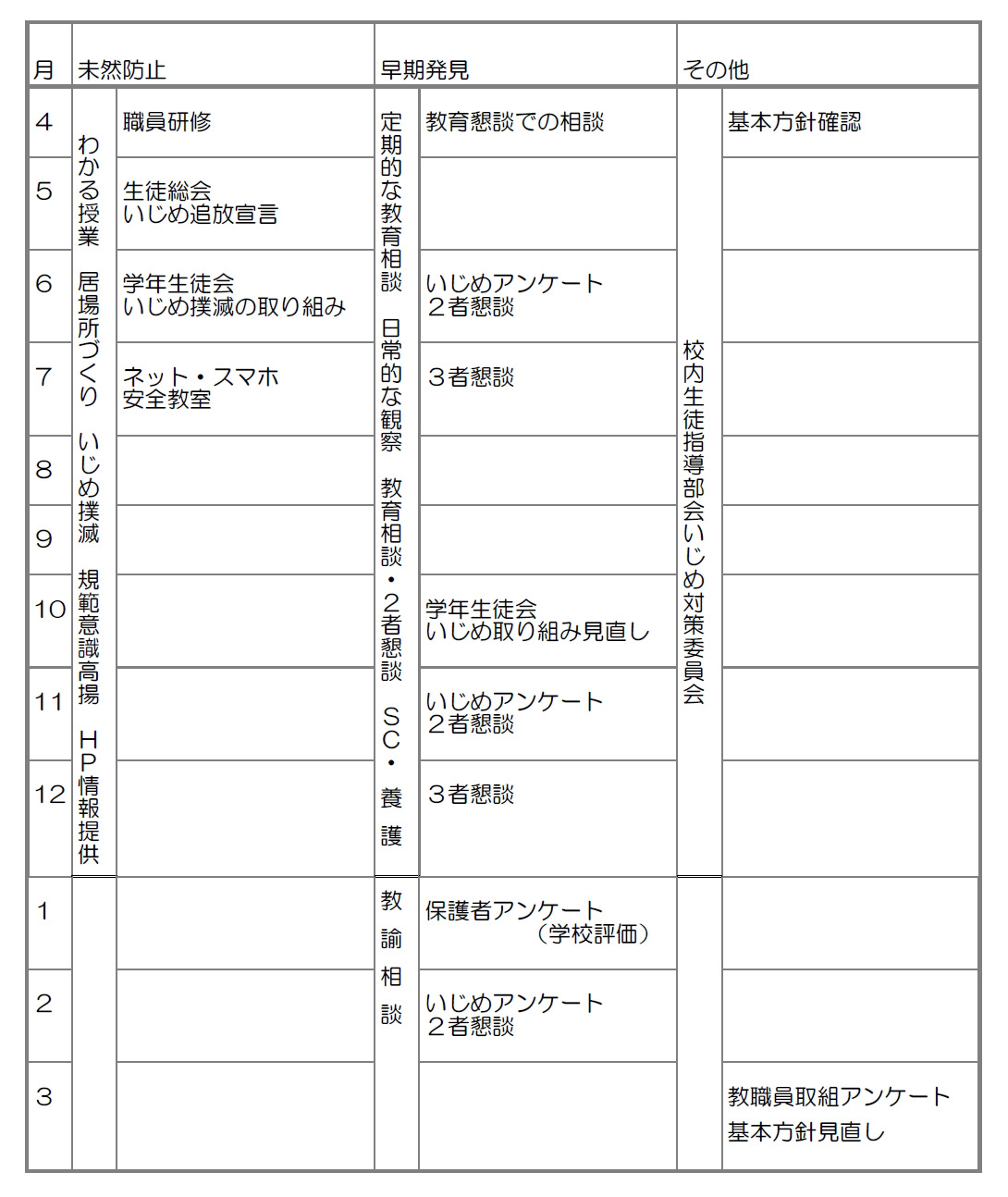 「いじめが起こらない学級・学校づくり」を始めとする未然防止に取り組む。基本は、好ましい人間関係を築き、確かな学力と豊かな心を育て、規則正しい態度で授業や行事に主体的に参加・活躍できる学校づくりを進めていくことである。また、未然防止のための常態的・先行的対応である「発達支持的生徒指導」の充実も図る。